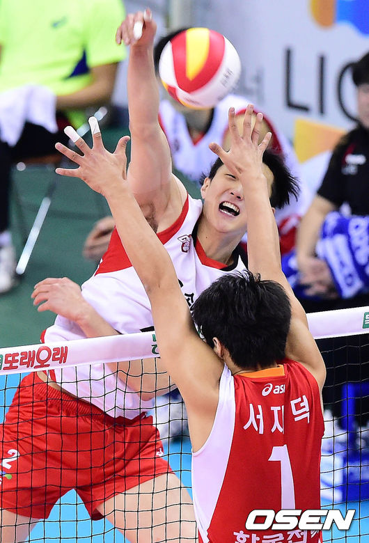 12일 오후 경북 구미시 박정희체육관에서 열린 '2014-2015 NH농협 V-리그' LIG 손해보험과 한국전력의 경기 2세트 손현종이 공격을 시도하고 있다.