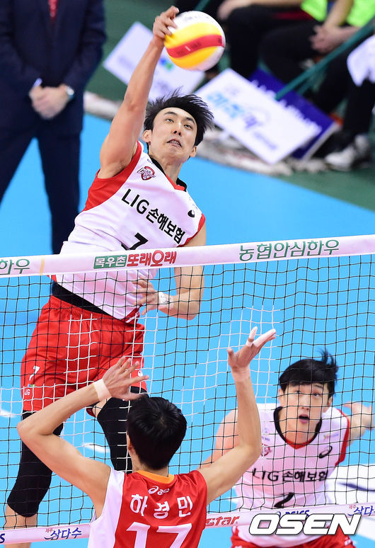 12일 오후 경북 구미시 박정희체육관에서 열린 '2014-2015 NH농협 V-리그' LIG 손해보험과 한국전력의 경기 2세트 하현용이 공격을 시도하고 있다.