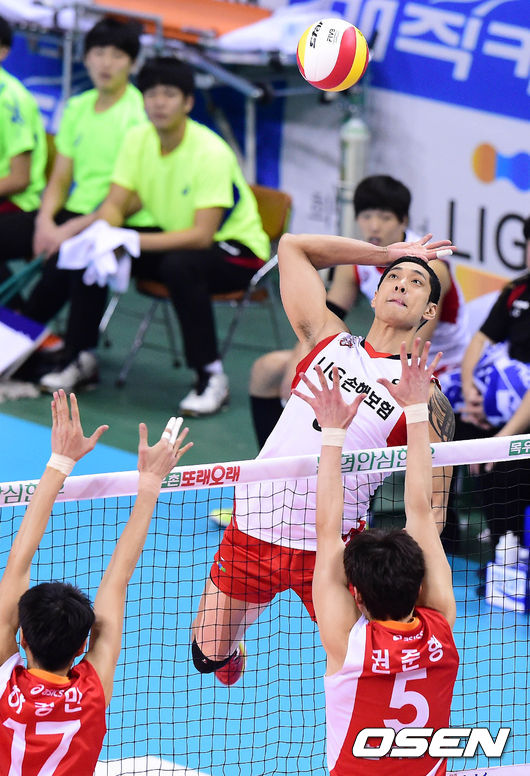 12일 오후 경북 구미시 박정희체육관에서 열린 '2014-2015 NH농협 V-리그' LIG 손해보험과 한국전력의 경기 2세트 김요한이 공격을 시도하고 있다.