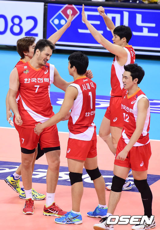 한국전력이 12일 구미 박정희체육관에서 열린 2014-2015시즌 NH농협 V리그 남자부 4라운드 LIG손해보험과 경기서 세트스코어 3-1(19-25, 25-20, 25-19, 25-22) 승리를 거뒀다. 이날 승리로 한국전력은 2연패를 탈출하며 11승 10패(승점 31)로 승수에서 현대캐피탈(9승 12패, 승점 31)에 앞선 4위로 올라섰다. 반면 LIG손해보험은 7승 15패(승점 20)에 머물렀다. / baik@osen.co.kr
