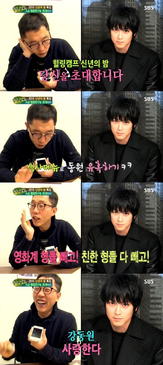 김제동은 12일 방송된 SBS 예능프로그램 ‘힐링캠프, 기쁘지 아니한가’에서 신년의 밤 손님으로 초대하기 위해 강동원에게 전화를 걸었다.