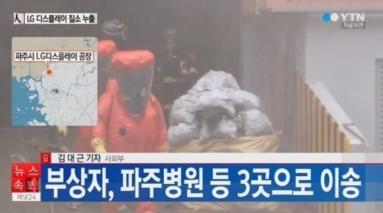 12일 경기도 파주에 위치판 LG디스플레이 패널 공장에서 질소 가스가 누출돼 직원들이 비상대피하는 모습이 실황으로 전해졌다. 이날 가스 누출로 2명이 사망하고, 4명이 병원에 입원했다.
