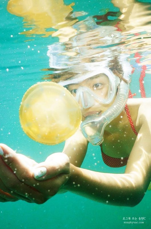 공개된 사진 속 최송현은 팔라우 해파리 호수(jellyfish lake)에서 비키니 차림으로 스노쿨링을 즐기고 있다. 특히 투명한 몸에서 빛을 발하는 해파리의 신비한 모습이 눈길을 끈다.