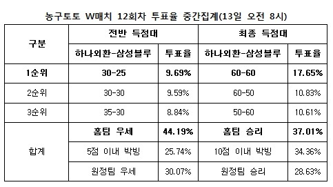 국민체육진흥공단(www.kspo.or.kr)이 발행하는 체육진흥투표권 공식 온라인 발매사이트인 베트맨(www.betman.co.kr)이 오는 14일 오후 7시 부천실내체육관에서 벌어지는 하나외환-삼성블루밍스전을 대상으로 한 농구토토 W매치 12회차 투표율을 중간 집계한 결과, 전체 참가자의 37.01%가 홈팀 하나외환의 우세를 예상하는 것으로 나타났다.