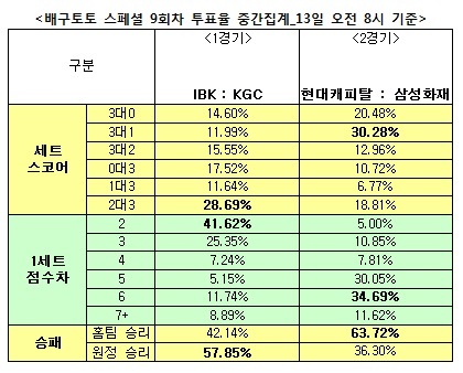 [배구토토] 국민체육진흥공단(www.kspo.or.kr)이 발행하는 체육진흥투표권 공식 인터넷 발매사이트 베트맨(www.betman.co.kr)이 오는 14일 열리는 2014-15시즌 국내프로배구(V리그)를 대상으로 한 배구토토 스페셜 9회차 투표율 중간집계 결과, 국내 배구팬 63.72%는 현대캐피탈-삼성화재(2경기)전에서 현대캐피탈의 우세를 전망했다고 밝혔다.