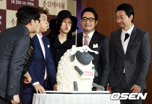 13일 오후 서울 여의도 63빌딩에서 열린 tvN 새 토크쇼 '수요미식회' 제작발표회에 참석한 출연진들이 기념 케이크와 함께 포즈를 취하고 있다.