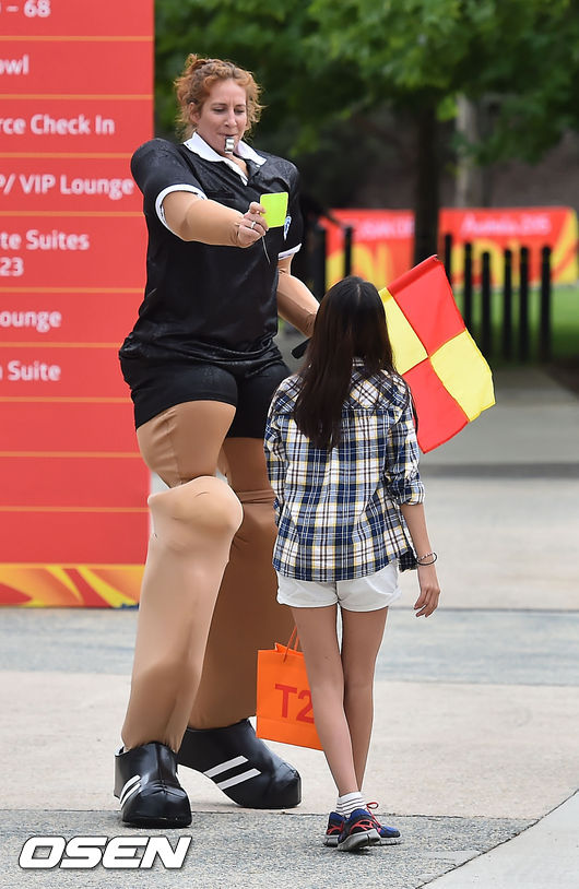 13일 오후(이하 한국시간) 호주 캔버라 스타디움에서 '2015 AFC 아시안컵 조별리그 2차전' 한국-쿠웨이트의 경기가 열릴 예정인 가운데 경기장 밖에서 광대들이 축구 팬들에게 장난을 치고 있다.