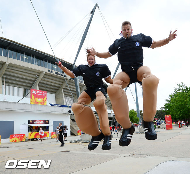 13일 오후(이하 한국시간) 호주 캔버라 스타디움에서 '2015 AFC 아시안컵 조별리그 2차전' 한국-쿠웨이트의 경기가 열릴 예정인 가운데 경기장 밖에서 광대들이 화려한 공연을 펼치고 있다.