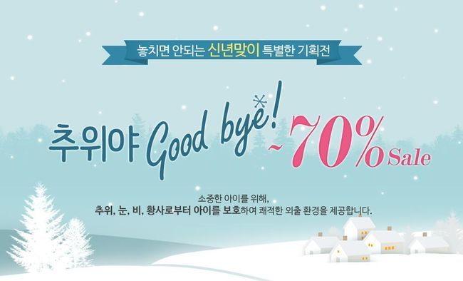 추운 날씨 신년맞이 방한용품기획전도 흥미롭다. 소중한 아이를 추위, 눈, 비, 황사로부터 보호하여 쾌적한 외출환경을 제공할 수 있도록 유모차, 카시트 액세서리를 최대 70% 할인된 금액으로 만날 수 있다. 할인 품목으로는 퀴니의 4계절커버, 친환경 클린커버, 풋머프, 캐리콧, 베이비코쿤 등과 맥시코시 풋머프, 시트커버, 전용 블랭킷 등이며 18일까지 할인된 금액으로 구입 가능하다.