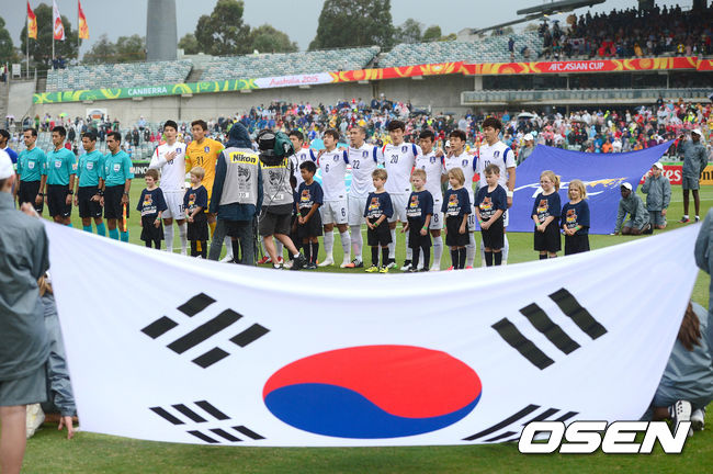 13일 오후(이하 한국시간) 호주 캔버라 스타디움에서 열린 '2015 AFC 아시안컵 조별리그 2차전' 한국-쿠웨이트의 경기,태극전사들이 어깨동무를 하고 애국가를 부르고 있다.