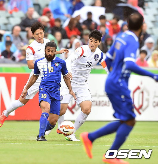 13일 오후(이하 한국시간) 호주 캔버라 스타디움에서 열린 '2015 AFC 아시안컵 조별리그 2차전' 한국-쿠웨이트의 경기,기성용이 쿠웨이트 알 마샨을 수비하고 있다.