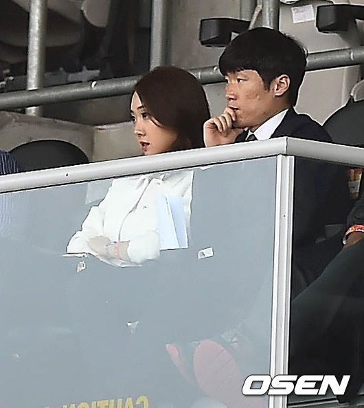 13일 오후(이하 한국시간) 호주 캔버라 스타디움에서 열린 '2015 AFC 아시안컵 조별리그 2차전' 한국-쿠웨이트의 경기,박지성이 아내 김민지와 한국-쿠웨이트 경기를 지켜보고 있다.