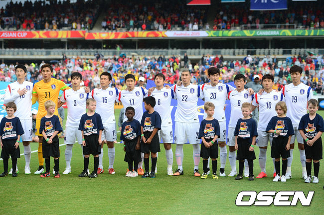 13일 오후(이하 한국시간) 호주 캔버라 스타디움에서 열린 '2015 AFC 아시안컵 조별리그 2차전' 한국-쿠웨이트의 경기,태극전사들이 애국가가 나오자 어깨동무를 하고 필승을 다짐하고 있다.