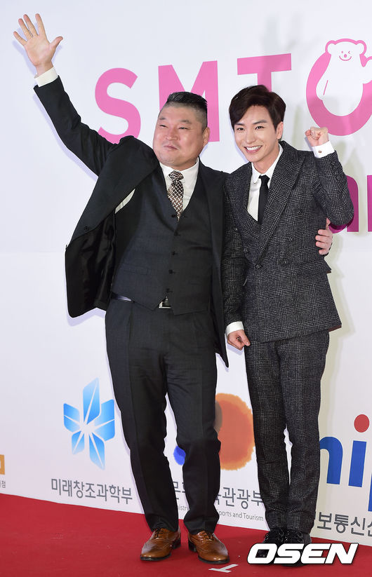 13일 서울 삼성동 코엑스에서 열린 'SMTOWN@coexartium(SMTOWN 코엑스 아티움)' 오픈식 행사에서 방송인 강호동과 슈퍼주니어 이특이 포토타임을 갖고 있다.