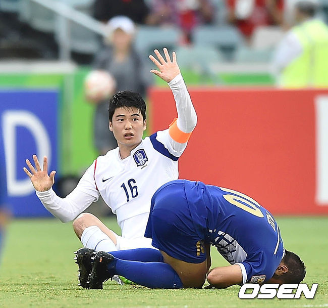 13일 오후(이하 한국시간) 호주 캔버라 스타디움에서 열린 '2015 AFC 아시안컵 조별리그 2차전' 한국-쿠웨이트의 경기, 후반 기성용이 파울을 한 후 주심에게 고의적인 파울이 아니라는 제스쳐를 취하고 있다.