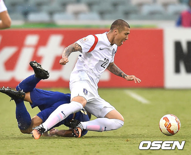 13일 오후(이하 한국시간) 호주 캔버라 스타디움에서 열린 '2015 AFC 아시안컵 조별리그 2차전' 한국-쿠웨이트의 경기, 후반 차두리가 태클에 걸려 넘어지고 있다.