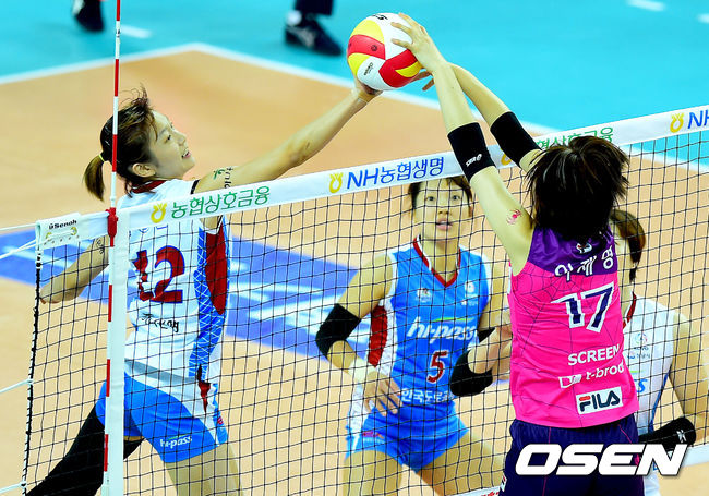 1세트, 한국도로공사 문정원이 흥국생명 이재영의 블로킹을 받으며 공격을 시도하고 있다. 이 때 이재영의 팔이 네트에 닿으며 도로공사의 득점 성공.