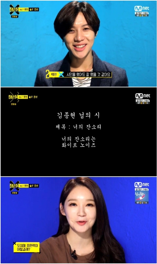 이날 태민은 종현에 대해 "시인을 했어도 잘 했을 것 같다. 허세라고 보실 수도 있는데, 계속 뭔가를 표현하고 싶은 걸 그런 쪽으로 표현한다. 음악적인, 아티스틱한 느낌이 있다. 표현을 되게 잘하고 표현력이 좋다"고 말했다. 강민경은 "대화를 하다보면 어떤 주제가 나왔을 때 꽂히면 끝까지 간다. 그걸 다이나믹하게 표현한다"고 말했다.