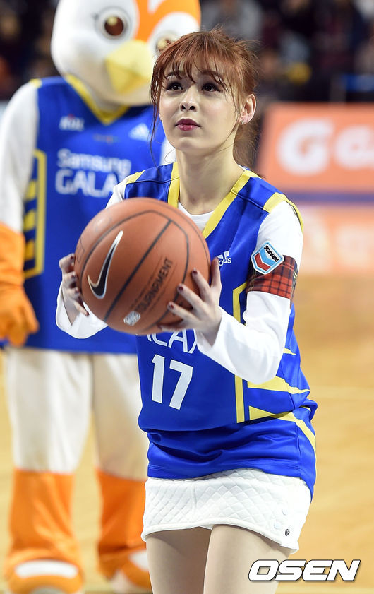 13일 오후 서울 잠실실내체육관서 열린 2014~2015 KCC 프로농구 서울 삼성과 울산 모비스의 경기에 앞서 배드키즈 모니카가 시투를 하고 있다.