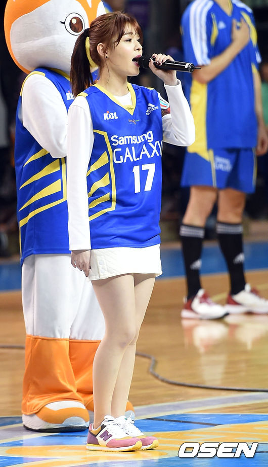 13일 오후 서울 잠실실내체육관서 열린 2014~2015 KCC 프로농구 서울 삼성과 울산 모비스의 경기에 앞서 배드키즈 모니카가 애국가를 제창하고 있다