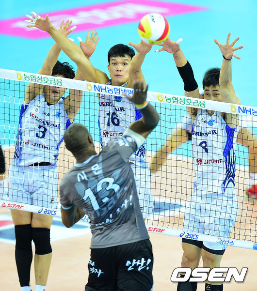 1세트, OK저축은행 시몬의 공격을 대한항공 황승빈-전진용-김학민이 블로킹 시도하고 있다.