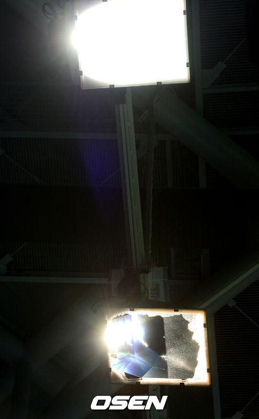 2세트가 진행되는 도중 천장 조명의 덮개가 깨지면서 파편이 쏟아져 경기장을 찾은 관람객들이 일부 대피하는 소동이 벌어졌다. 사진은 덮개가 깨진 조명의 모습.