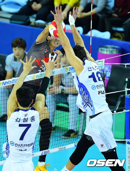 1세트, OK저축은행 송명근의 공격을 대한항공 산체스가 블로킹하고 있다./dreamer@osen.co.kr