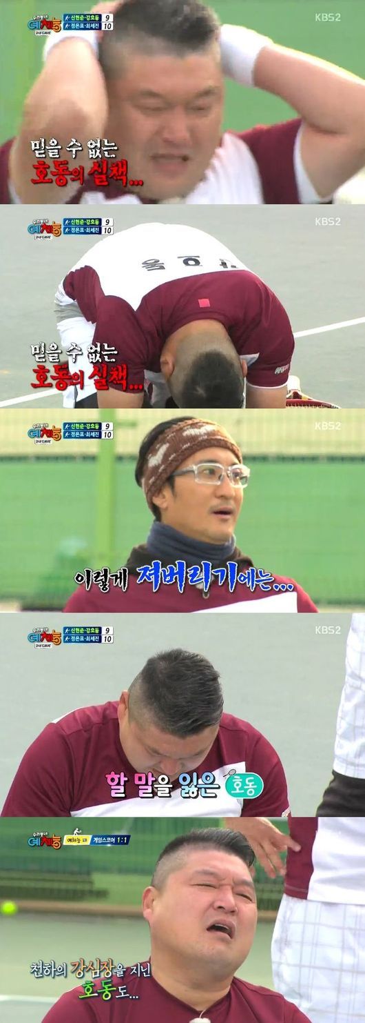 강호동이 어이 없는 실책으로 허망함에 무릎을 꿇고 좌절했다.