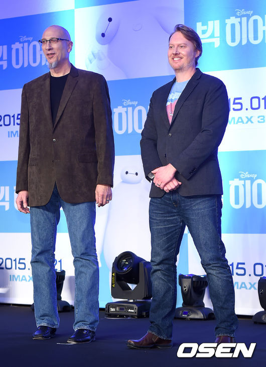 14일 오전 서울 여의도동 콘래드 서울호텔에서 열린 영화 '빅 히어로' 내한 기자회견에서 로이 콘리 프로듀서 돈홀 감독이 포토타임을 갖고 있다.