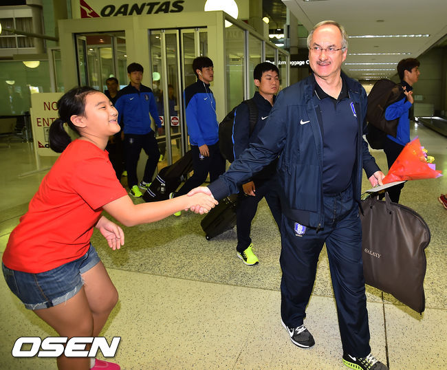 14일 오전(한국시간) 2015 AFC 호주 아시안컵대회 한국대표팀이 예선 3차전 호주와의 경기를 위해 브리즈번으로 이동했다. 브리즈번 공항에 슈틸리케 감독이 한국 교포 팬에게 꽃다발과 편지를 받고 악수를 하고 있다.