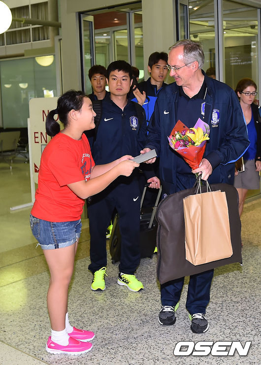 14일 오전(한국시간) 2015 AFC 호주 아시안컵대회 한국대표팀이 예선 3차전 호주와의 경기를 위해 브리즈번으로 이동했다. 브리즈번 공항에 도착한 슈틸리케 감독이 한국 교포 팬에게 꽃다발과 편지를 받고 있다.