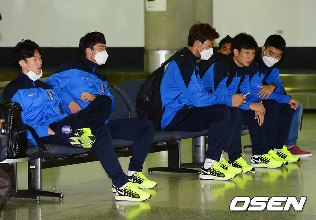 14일 오전(한국시간) 2015 AFC 호주 아시안컵대회 한국대표팀이 예선 3차전 호주와의 경기를 위해 브리즈번으로 이동했다. 브리즈번 공항에 도착한 대표팀 선수들이 마스크를 쓰고 있다.