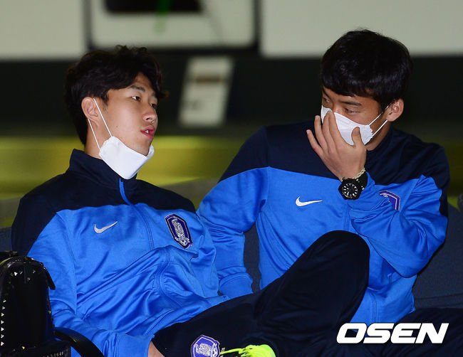 14일 오전(한국시간) 2015 AFC 호주 아시안컵대회 한국대표팀이 예선 3차전 호주와의 경기를 위해 브리즈번으로 이동했다. 브리즈번 공항에 도착한 손흥민과 김민우가 마스크를 낀채 얘기를 나누고 있다.