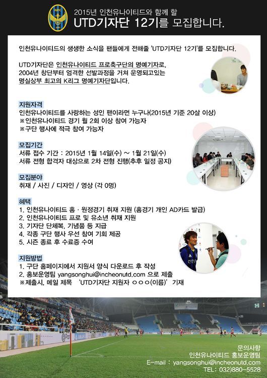 인천 유나이티드가 2015시즌을 함께할 UTD 기자단 12기를 모집한다.