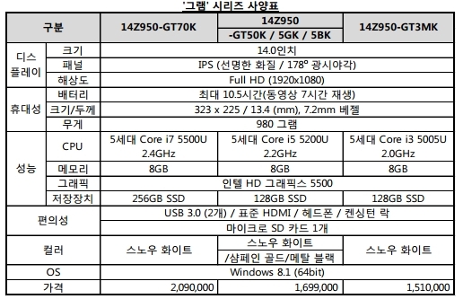 먼저 LG전자가 이날 처음 선보인 14형(35.5cm) 노트북 ‘그램 14’의 무게는 980g으로 국내 14형대 노트북 가운데 가장 가볍다. 이 제품은 한국기록원으로부터 국내에서 판매되는 14형 노트북 가운데 가장 가벼운 노트북으로 인증을 받았다.