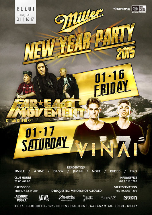 프리미엄 맥주 브랜드 ‘밀러 제뉴인 드래프트(Miller Genuine Draft, 이하 밀러)’는 열정 넘치는 젊은 소비자들과 소통하기 위해 EDM장르를 활용한다. 밀러는 이를 위해 복합문화공간 ‘엘루이(ELLUI)’와 협업해 1월 16일부터 17일 이틀에 걸쳐 진행하는 'Miller x Ellui 2015 New Year Party'에 세계적인 일렉트로 힙합 뮤지션 ‘파 이스트 무브먼트(Far East Movement)’와 화려한 실력을 뽐내는 세계적 DJ듀오 ‘비나이(VINAI)’를 초청한다.