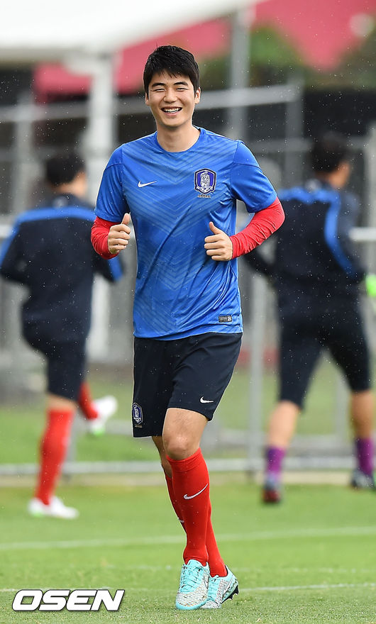 14일 오후(한국시간) 호주 브리즈번 페리 파크에서 2015 AFC 호주 아시안컵대회 한국대표팀이 예선 3차전 호주와의 경기를 위해 훈련을 가졌다. 기성용이 빗속에서 훈련을 하며 환하게 웃고 있다.