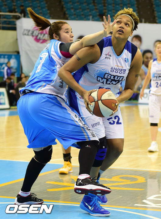 14일 오후 경기도 부천실내체육관에서 열린 'KB국민은행 2014-2015 여자프로농구' 하나외환과 삼성의 경기 1쿼터, 삼성 켈리가 하나외환 정선화 수비를 뚫고 골밑을 노리고 있다.
