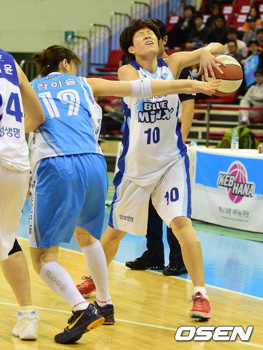 14일 오후 경기도 부천실내체육관에서 열린 'KB국민은행 2014-2015 여자프로농구' 하나외환과 삼성의 경기 1쿼터, 하나외환 강이슬이 삼성 고아라가 공을 놓치고 있다.