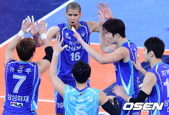 14일 오후 천안 유관순체육관에서 열린 '2014-2015 NH농협 V-리그' 현대캐피탈과 삼성화재의 경기 1세트 삼성화재 선수들이 득점 후 기뻐하고 있다.