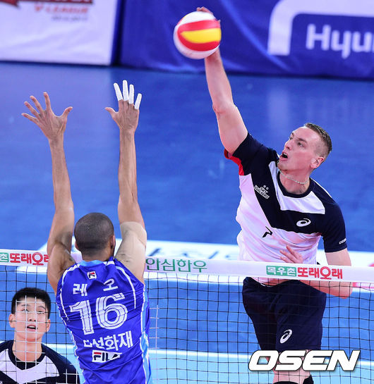 14일 오후 천안 유관순체육관에서 열린 '2014-2015 NH농협 V-리그' 현대캐피탈과 삼성화재의 경기 1세트 케빈이 공격을 시도하고 있다.