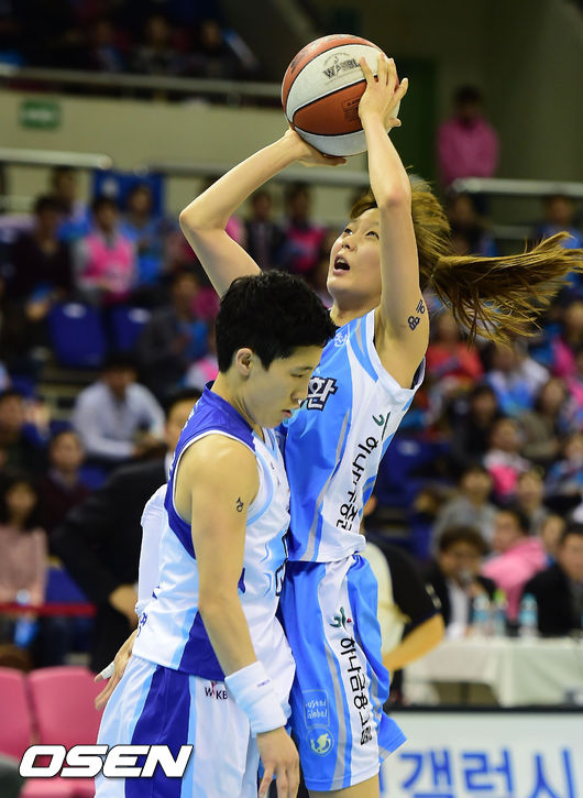 14일 오후 경기도 부천실내체육관에서 열린 'KB국민은행 2014-2015 여자프로농구' 하나외환과 삼성의 경기 3쿼터,하나외환 신지현이 슛을 하고 있다.