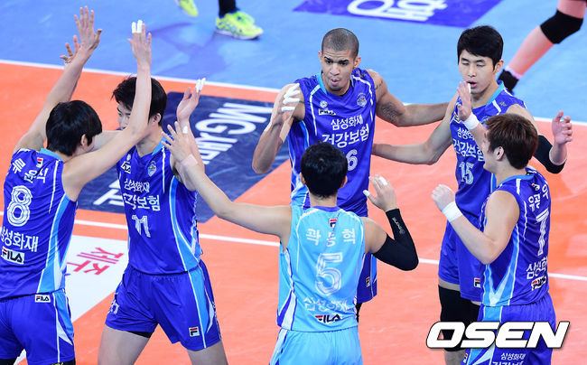 14일 오후 천안 유관순체육관에서 열린 '2014-2015 NH농협 V-리그' 현대캐피탈과 삼성화재의 경기 1세트 삼성화재 선수들이 득점 후 기뻐하고 있다.