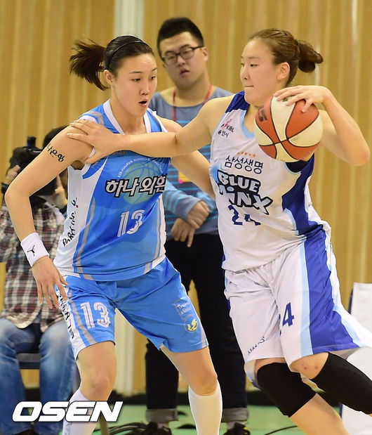 14일 오후 경기도 부천실내체육관에서 열린 'KB국민은행 2014-2015 여자프로농구' 하나외환과 삼성의 경기 3쿼터,삼성 배혜윤이 하나외환 김정은 수비를 돌파하고 있다.