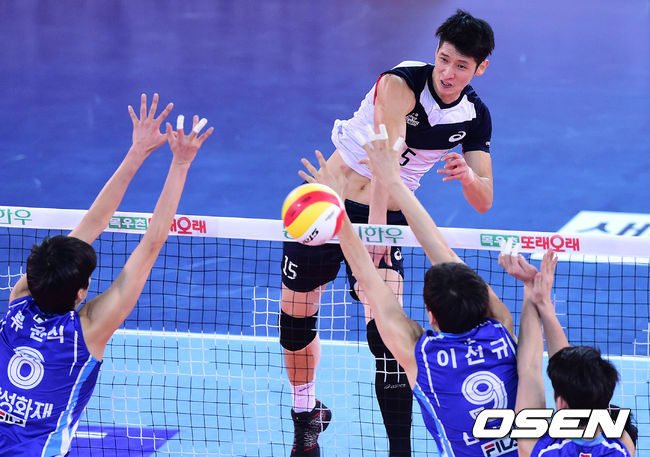 14일 오후 천안 유관순체육관에서 열린 '2014-2015 NH농협 V-리그' 현대캐피탈과 삼성화재의 경기 1세트 문성민이 공격을 시도하고 있다.