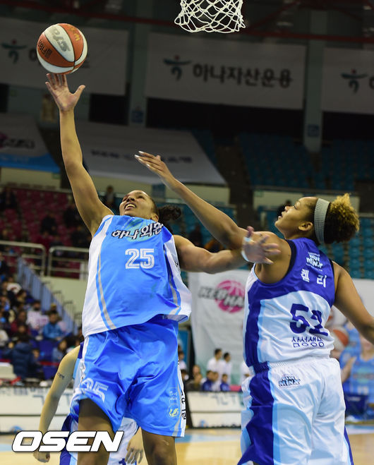 14일 오후 경기도 부천실내체육관에서 열린 'KB국민은행 2014-2015 여자프로농구' 하나외환과 삼성의 경기 4쿼터,하나외환 토마스가 골밑슛을 하고 있다.