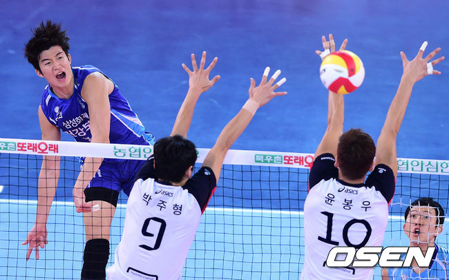 14일 오후 천안 유관순체육관에서 열린 '2014-2015 NH농협 V-리그' 현대캐피탈과 삼성화재의 경기 2세트 김명진이 공격을 시도하고 있다.