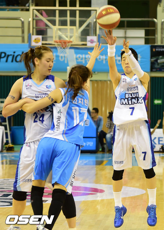 14일 오후 경기도 부천실내체육관에서 열린 'KB국민은행 2014-2015 여자프로농구' 하나외환과 삼성의 경기 1쿼터, 삼성 박태은이 슛을 성공시키고 있다.