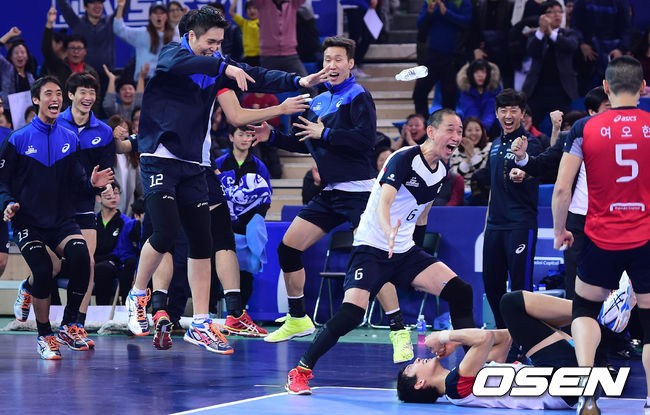 14일 오후 천안 유관순체육관에서 열린 '2014-2015 NH농협 V-리그' 현대캐피탈과 삼성화재의 경기 종료 후 현대캐피탈 선수들이 환호하고 있다.