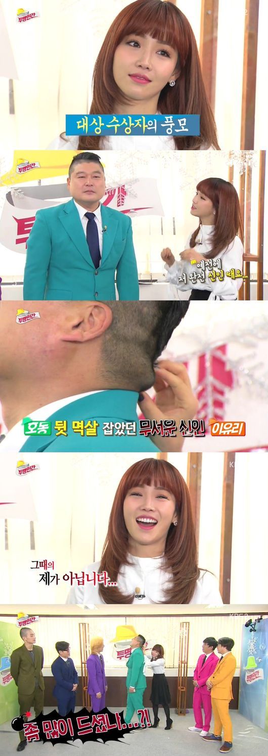 14일 오후 방송된 KBS 2TV 예능프로그램 '투명인간'에 게스트로 출연한 이유리는 등장하자마자 강호동의 뒷 멱살을 잡아 웃음을 자아냈다.